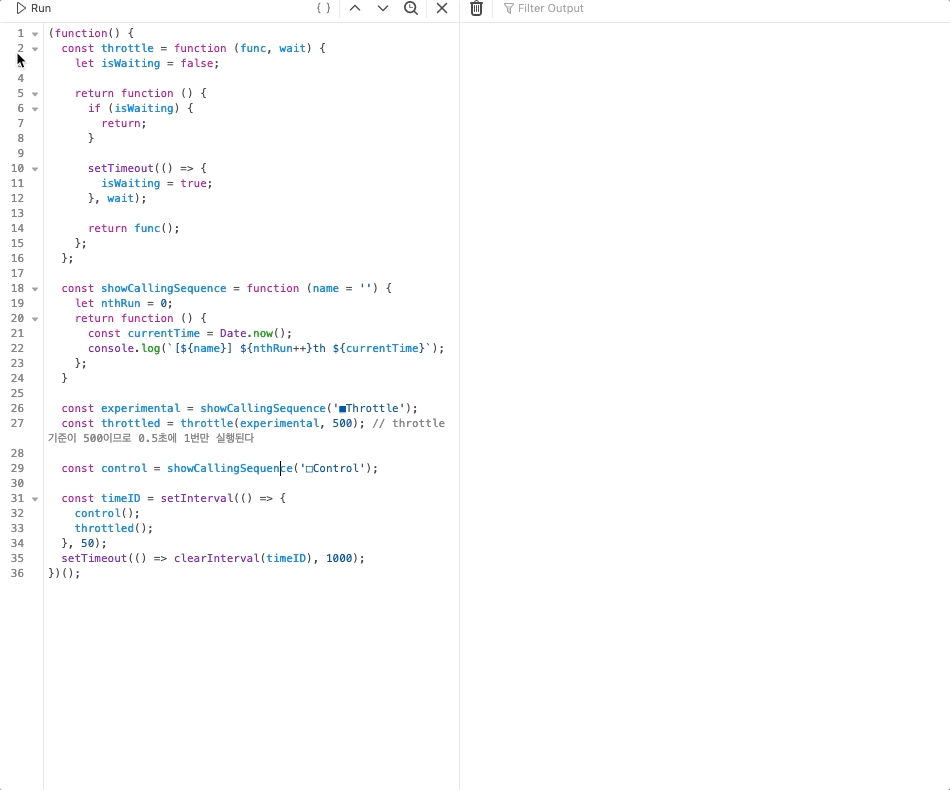 const experimental = showCallingSequence('■Throttle'); const throttled = throttle(experimental, 500); // throttle 기준이 500이므로 0.5초에 1번만 실행된다 const control = showCallingSequence('□Control');1초 동안 0.05초 주기로 각각 실행을 시켜본다.
