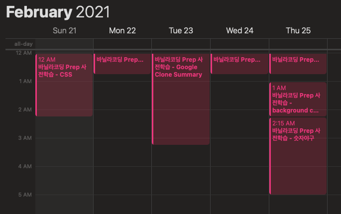 과제 수행에 필요했던 시간은 과제마다 달랐지만(기수별로 과제도 달라지는 것 같다) 보통은 10시간 ~ 20시간 이내였다. 내가 CSS에 그렇게 시간을 많이 쏟지 않아서인 것도 있다. (그리고 이후 꾸준히 후회를 하게 된다.) 나는 과제 자체보다는 다른 코드리뷰를 살펴보는 데 시간을 많이 썼다.2021. 04. 09. 금요일.