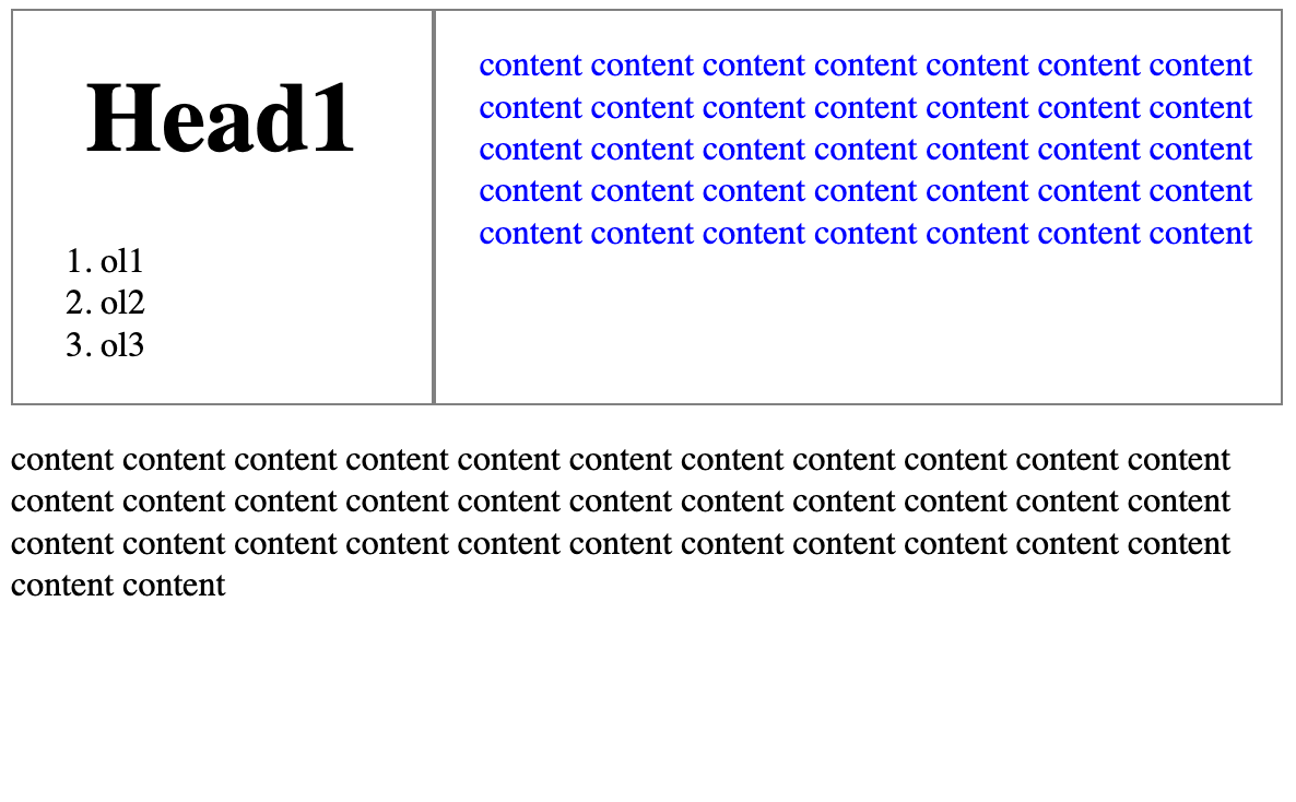 <!DOCTYPE html> <html> <head> <meta charset="utf-8"> <style> #grid { /* 아래에서 grid id를 준 div 구역의 레이아웃을 */ display:grid; /* 그리드 컨테이너로 지정하고 */ grid-template-columns:1fr 2fr; /* 해당 그리드 내부를 가로로 1:2로 나누고 */ border:gray 1px solid; /* 박스 테두리를 회색 1px 직선 추가 */ } #grid h1 { /* h1태그 중 #grid의 자식 태그인 경우 */ font-size:45px; /* 글꼴 크기를 45px로 변경하고 */ text-align:center; /* 가운데 정렬 */ } #grid .left { /* left클래스 중 #grid 태그의 자식 태그인 경우 */ border-right:2px gray solid; /* 해당 박스 오른쪽 테두리에 2px의 회색 직선 추가 */ } #grid .right p { /* p태그 중 #grid .right 태그의 자식 태그인 경우 */ padding-left:20px; /* 왼쪽 padding을 20px로 지정 */ color:blue; /* 글자 색깔을 파란색으로 지정 */ } </style> </head> <body> <div id="grid"> <!-- 레이아웃 지정이 필요한 부분을 div 태그로 묶고 id 부여 --> <div class="left"> <!-- #grid의 자식 부분. 여기도 div 태그로 묶고 class 부여 --> <h1>Head1</h1> <ol> <li>ol1</li> <li>ol2</li> <li>ol3</li> </ol> </div> <div class="right"> <!-- #grid의 자식 class --> <p> <!-- #grid와 .right의 자식 element --> content content content content content content content content content content content content content content content content content content content content content content content content content content content content content content content content content content content </p> <!-- 위 <style>에서 #grid .right p 선택자의 적용을 받음 --> </div> </div> <p> <!-- 여기는 부모 없는 일반 element --> content content content content content content content content content content content content content content content content content content content content content content content content content content content content content content content content content content content </p> <!-- 부모가 없기 때문에 #grid .right p 선택자의 영향을 받지 않음 --> </body> </html>위 코드의 결과는 아래 그림과 같음