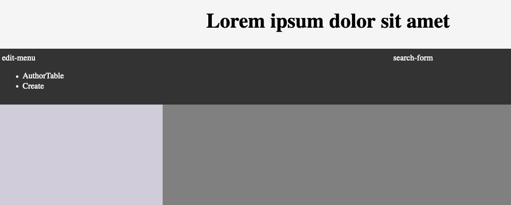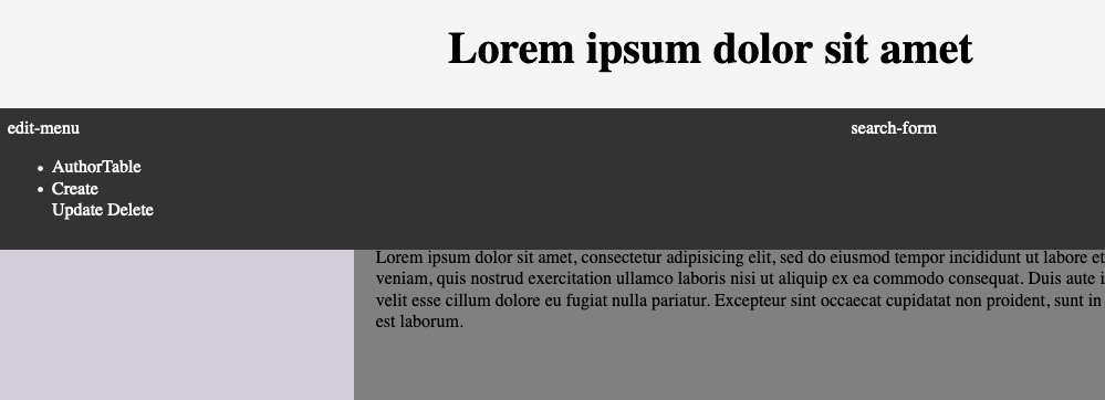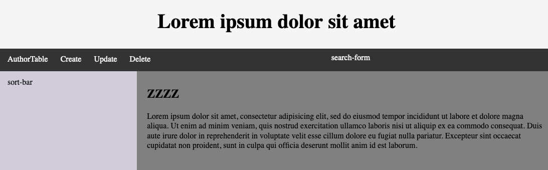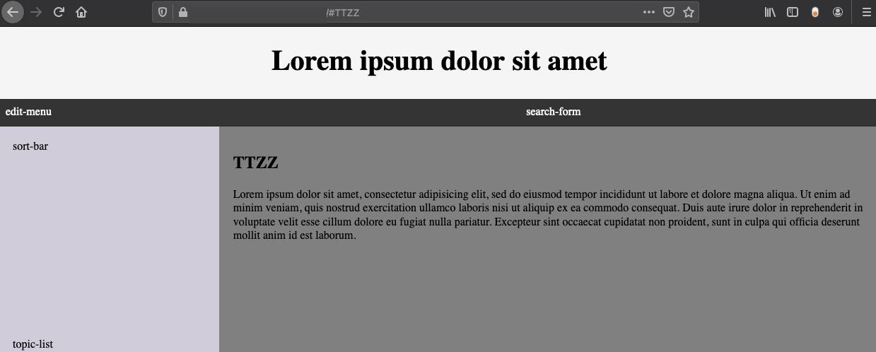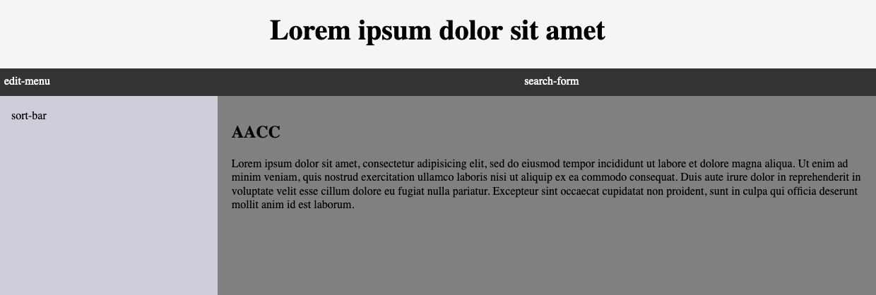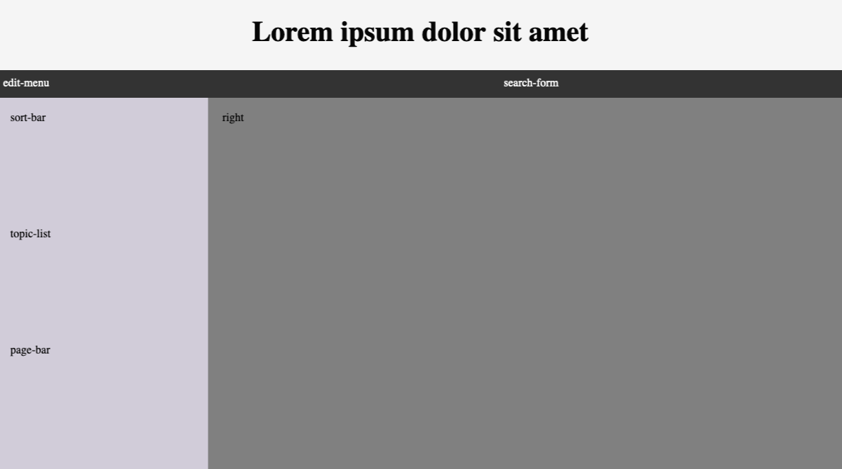 <!DOCTYPE html> <html lang="en" dir="ltr"> <head> <meta charset="utf-8"> <title>Lorem ipsum dolor sit amet</title> </head> <body> <div class="banner"> <h1>Lorem ipsum dolor sit amet</h1> <nav class="edit"> <div class="edit-menu">edit-menu</div> <div class="search-form">search-form</div> </nav> </div> <div class="main"> <div class="left"> <div class="sort-bar">sort-bar</div> <div class="topic-list">topic-list</div> <div class="page-bar">page-bar</div> </div> <div class="right">right</div> </div> </body> </html>그리고 스타일을 줘서 기본 레이아웃을 만들었다.