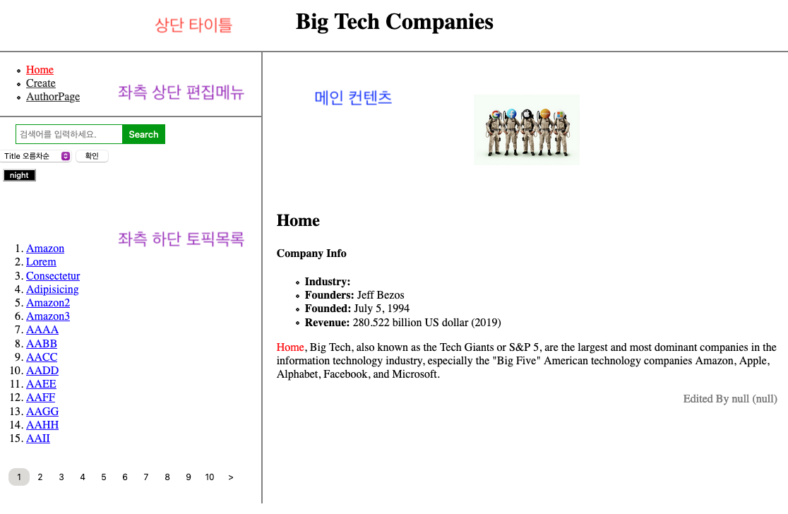 var viewTopic = function(pageNum){ if (pageNum === undefined){ // 현재 페이지 기본값 설정 pageNum = 1; } try { // 정렬 기본값 설정 var sortBy = document.getElementById("sort").value; } catch { var sortBy = 'title-asc'; } fetch('/page/' + sortBy + '/' + String(pageNum)).then(function(response){ response.json().then(function(data){ var topicList = data['topicList']; // 데이터 구조가 topic-temp와 달라졌다 var content = `<ul>`; for (var j in topicList){ var topic = topicList[j]; content += `<li><a class="topic-item" href="#!${topic['title']}" onclick="viewContent(${topic['id']});">${topic['title']}</a></li>`; } content += `</ul>`; document.querySelector('.topic-list').innerHTML = content; activeRed(); }); }); } window.addEventListener("load", viewTopic());아까 topic-temp에서 작동했던 기능이 정상 작동하는지 확인하고