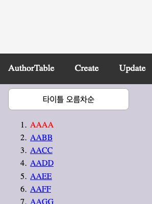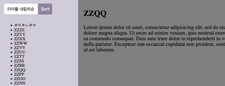 <div class="sort-bar"> <select id="sort" onchange="changeSort(this.value);"> <option value="title-asc">타이틀 오름차순</option> <option value="title-desc">타이틀 내림차순</option> <option value="created-asc">일자 오름차순</option> <option value="created-desc">일자 내림차순</option> <input type="submit" value="Sort" class="sort-button"> </select> </div>이제 changeSort() 함수에서 토픽메뉴를 정렬하면 된다. 우선 토픽메뉴를 만든다.
