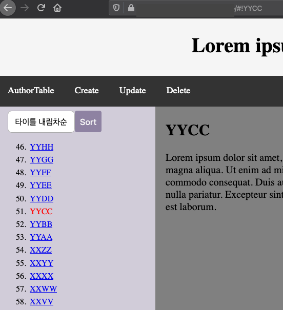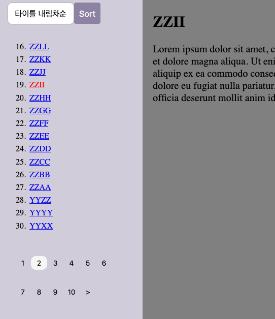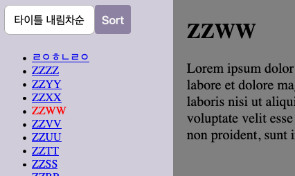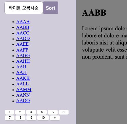 var viewTopic = function(topicData, startTopic, id){ var content = `<ol start=${startTopic}>`; for (var j in topicData){ var topic = topicData[j]; if ((id === 0 && Number(j) === 0) || (topic['id'] === id)){ // id가 없고 첫번째 페이지거나 & id가 topic의 id와 같은 경우 - 현재 페이지 content += `<li><a id="active" class="topic-item" href="#!${topic['title']}" onclick="viewContent(${topic['id']});">${topic['title']}</a></li>`; if (id === 0){ // 첫번째 페이지일때만 갱신. id가 topic의 id와 같은 경우는 굳이 viewContent 갱신할 필요가 없다. viewContent(topic.id); window.location.hash = "!" + topic.title; } } else { content += `<li><a class="topic-item" href="#!${topic['title']}" onclick="viewContent(${topic['id']});">${topic['title']}</a></li>`; } } content += `</ol>`; return content; };그리고 테스트를 해본다. 특정 정렬에서 페이지를 넘기고 토픽을 선택한 후, 정렬만 변경했을 때 페이지/토픽만 변하고 오른쪽의 데이터는 변하지 않으면 성공이다.