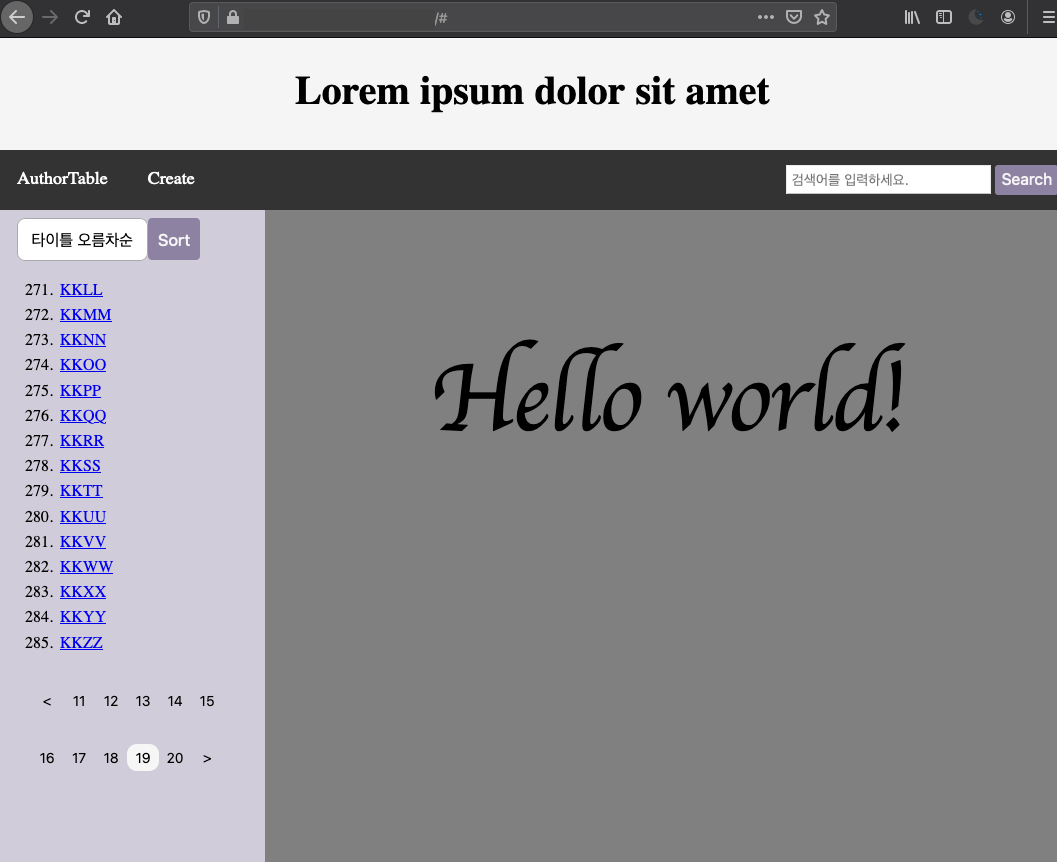 var viewPageBar = function(pageNum){ if (pageNum === undefined){ pageNum = 1; } try { var sortBy = document.getElementById("sort").value; } catch { var sortBy = 'title-asc'; }; fetch('/page/' + sortBy + '/' + String(pageNum)).then(function(response){ response.json().then(function(data){ var pageBar = '<div class="page-bar">'; var pageCount = data['pageInfo']['blockFirst']; if (data['pageInfo']['curBlock'] > 1){ // 첫 페이지가 아니면 pageBar += `<button class="button-page" onclick="viewPageBar(${pageCount-1})"><</button>`; } while (pageCount < data['pageInfo']['blockLast']+1){ if (pageCount === data['pageInfo']['curPage']){ // 현재 페이지인 경우 pageBar += `<button class="button-page" onclick="viewPageBar(${pageCount})" id="current-page">${pageCount}</button>`; } else { pageBar += `<button class="button-page" onclick="viewPageBar(${pageCount})">${pageCount}</button>`; } pageCount++; } if (data['pageInfo']['curBlock'] < data['pageInfo']['totalBlock']){ // 마지막 페이지가 아니면 pageBar += `<button class="button-page" onclick="viewPageBar(${pageCount+1})">></button>`; } pageBar += '</div>' document.querySelector('.page-bar').innerHTML = pageBar; viewTopic(pageNum); // 페이지가 갱신되면 토픽목록도 갱신해줘야 한다 }); }); }정상 작동하는지 확인한다.