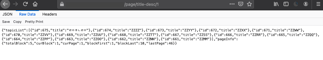 위에서 토픽목록을 가져올 때, 0번 데이터부터 15개를 가져왔다. API url은 topic-temp/title-asc/0을 썼다. 여기가 1번 페이지 범위다.