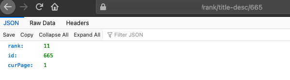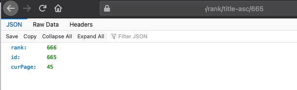 var http = require('http'); var url = require('url'); var path = require('path'); var db = require('./db'); var app = http.createServer(function(request, response){ var _url = request.url; var pathname = url.parse(_url, true).pathname; url_parsed = pathname.split('/'); if (url_parsed[1] === 'rank') { var sortBy = url_parsed[2]; var id = Number(url_parsed[3]); var sortByBool = ['title-asc', 'title-desc', 'created-asc', 'created-desc'].includes(sortBy); if ((Number.isInteger(id)) && sortByBool) { var sortBy = ' ORDER BY ' + sortBy.replace("-", " "); var query1 = `SET @rank=0`; var query2 = `SELECT rank, id FROM (SELECT @rank:=@rank+1 AS rank, id, title FROM test ${sortBy})sub WHERE id = ?;` db.query(query1, function(err1, result1){ if (err1) { throw err1 }; db.query(query2, id, function(err2, result2){ if (err2) { throw err2 }; if (result2.length === 0) { // 값이 나오지 않으면, 없는 id이면 response.writeHead(404); response.end(); } else { result = result2[0]; result['curPage'] = Math.ceil(result['rank']/topicPerPage); // 페이지정보 response.writeHead(200, { 'Content-Type': 'application/json' }); response.end(JSON.stringify(result)); } }); }); } else { response.writeHead(404); response.end('Data Not Found'); }; } else { response.writeHead(200); response.end(fs.readFileSync(__dirname + '/index.html')); // 기본적으로는 여기 } }); app.listen(3000);id 665로 테스트해보았다.