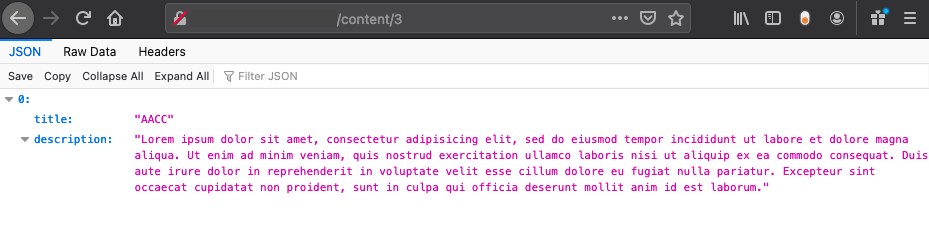 var http = require('http'); var url = require('url'); var path = require('path'); var db = require('./db'); var app = http.createServer(function(request, response){ var _url = request.url; var pathname = url.parse(_url, true).pathname; url_parsed = pathname.split('/'); if (url_parsed[1] === 'content') { var id = Number(url_parsed[2]); if (Number.isInteger(id)) { var result = ''; db.query(`SELECT JSON_ARRAYAGG(JSON_OBJECT('title', title, 'description', description)) as '?' FROM test WHERE id = ?`, [id, id] , function(err, data){ if (err) { throw err;}; if (data.length === 0){ // 값이 나오지 않으면, 없는 id이면 response.writeHead(404); response.end('Data Not Found'); } else { result = data[0][id]; response.setHeader('Content-Type', 'application/json'); response.end(result); } }); }; } else { response.writeHead(200); response.end(fs.readFileSync(__dirname + '/index.html')); // 기본적으로는 여기 } }); app.listen(3000);그러고나서 페이지에서 url/content/3을 입력해서 3번 데이터가 잘 출력되나 확인해본다.