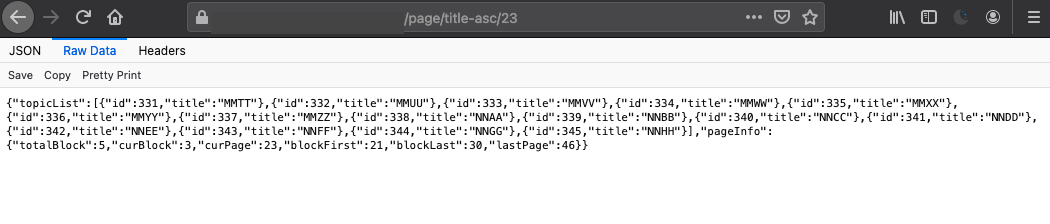 그러면 2번 페이지를 만들기 위해서는 topic-temp/title-asc/15(인덱스가 1부터 시작하기 때문)를 쓰면 되고,
