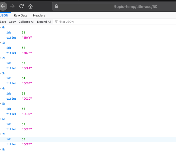 var http = require('http'); var url = require('url'); var path = require('path'); var db = require('./db'); var app = http.createServer(function(request, response){ var _url = request.url; var pathname = url.parse(_url, true).pathname; url_parsed = pathname.split('/'); if (url_parsed[1] === 'topic-temp'){ var sortBy = url_parsed[2]; var start = Number(url_parsed[3]); if (['title-asc', 'title-desc', 'created-asc', 'created-desc'].includes(sortBy)){ var sortBy = 'ORDER BY ' + sortBy.replace("-", " "); var query = `SELECT JSON_ARRAYAGG(JSON_OBJECT('id', id, 'title', title)) as topic FROM (SELECT id, title FROM test ${sortBy} LIMIT ? OFFSET ?)sub`; if (Number.isInteger(start) && start >= 0){ db.query(query, [15, start], function(err, data){ if (err) {throw err}; response.setHeader('Content-Type', 'application/json'); response.end(data[0]['topic']); }); } } else { response.writeHead(404); response.end('Data Not Found'); } } else { response.writeHead(200); response.end(fs.readFileSync(__dirname + '/index.html')); // 기본적으로는 여기 } }); app.listen(3000);API가 잘 작동하는지 확인해본다. id가 1부터 시작해서 50번째 데이터의 id는 51이다.