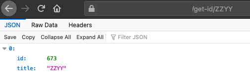 // main.js 라우팅 추가부분 } else if (url_parsed[1] === 'get-id') { var hash = url_parsed[2]; db.query(`SELECT JSON_ARRAYAGG(JSON_OBJECT('id', id, 'title', title)) as title FROM test WHERE title = ?`, [hash] , function(err, data){ if (err) { throw err;}; if (data.length === 0){ // 값이 나오지 않으면, 없는 id이면 response.writeHead(404); response.end(); } else { result = data[0]['title']; response.setHeader('Content-Type', 'application/json'); response.end(result); } });API가 잘 작동하나 확인해본다.