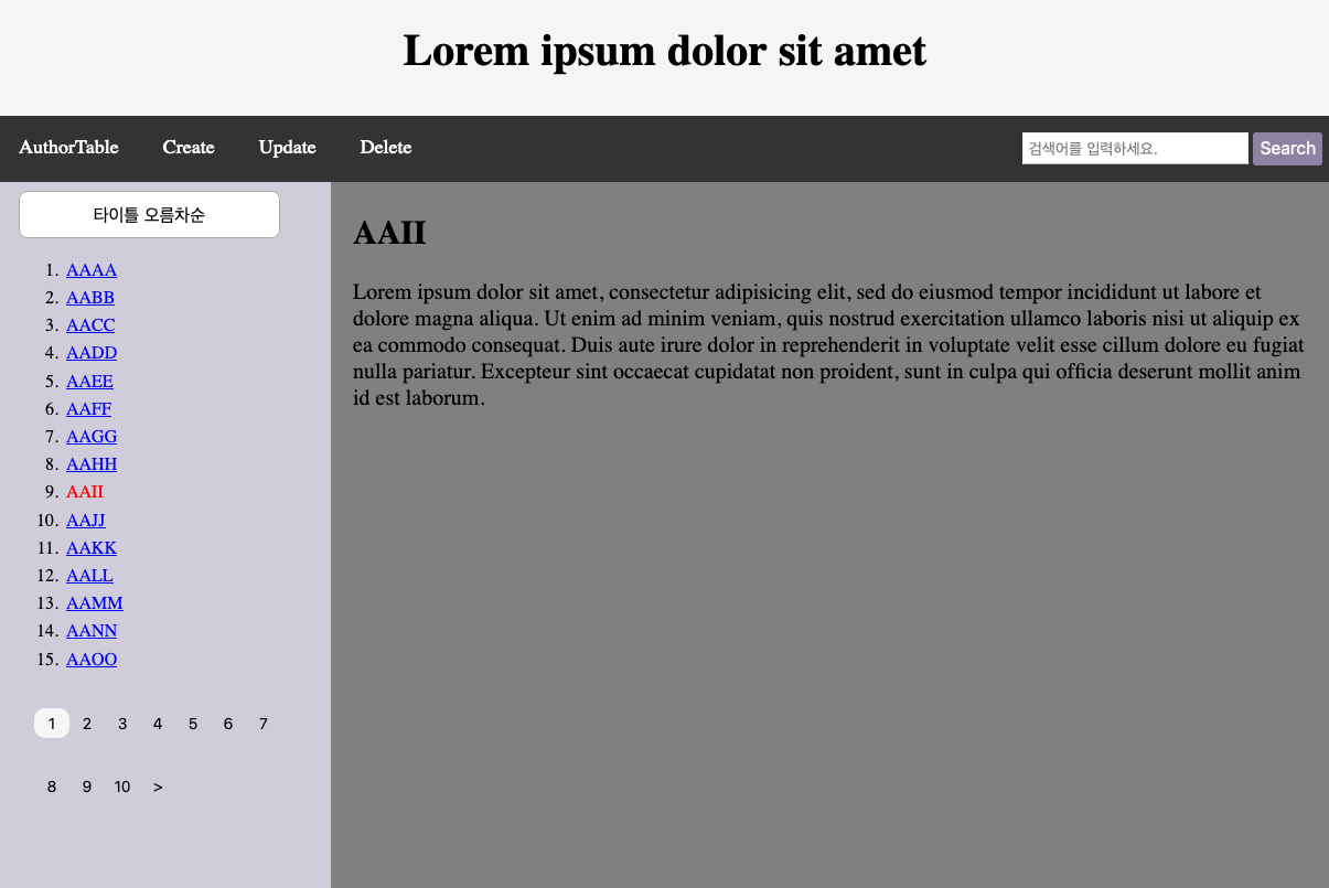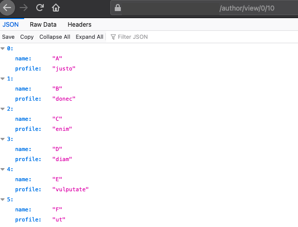 url은 author/view으로 하기로 하고, 데이터가 10개가 넘어가니까 일단 0-10범위의 데이터를 가져와서 출력해본다.