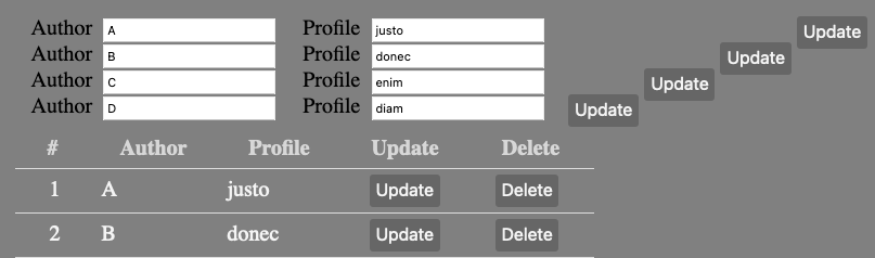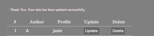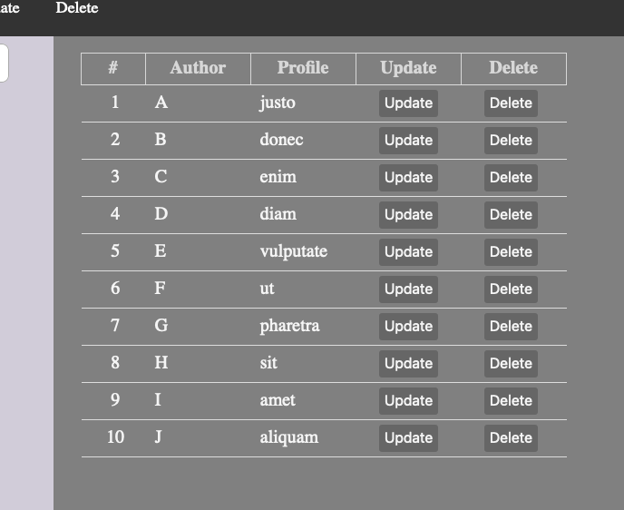 var authorPage = function(){ fetch('author/view/0/10').then(function(response){ response.json().then(function(data){ var trs = ``; for (var i in data){ var trs = trs + ` <tr> <td class="table-idx">${Number(i)+1}</td> <td>${data[i]['name']}</td> <td>${data[i]['profile']}</td> <td><button class="button-edit">Update</button></td> <td><button class="button-edit">Delete</button></td> </tr>`; } var table = ` <table class="author-table" border=2> <th class="table-idx">#</th> <th>Author</th> <th>Profile</th> <th>Update</th> <th>Delete</th> ${trs} </table>`; document.querySelector('.right').innerHTML = table; }); }); };잘 나오는지 확인해본다.