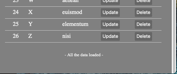 var authorPage = function(more){ if (more === undefined){ // 추가될 분량을 지정하지 않은 경우, 맨처음이니까 more = 15; var start = 0; // 인덱스 0에서 시작 } else { // 그렇지 않으면 테이블 마지막 줄에서 지정해둔 id 가져오기 var start = document.getElementById("last-author").innerHTML; } fetch(`author/view/${start}/${more}`).then(function(response){ response.json().then(function(data){ if (start === 0){ // 인덱스가 0인 경우 테이블을 만들어야 한다. var table = document.createElement('table'); table.setAttribute('id', 'author-table'); table.setAttribute('border', '2'); const idx = document.createElement('th'); idx.setAttribute('class', 'table-idx'); idx.innerHTML = '#'; table.appendChild(idx); const thlist = ['Author', 'Profile', 'Update', 'Delete']; for (var i in thlist){ const cell = document.createElement('th'); cell.innerHTML = thlist[i]; table.appendChild(cell); // th 추가 } } else { // 그렇지 않으면 이미 있는 테이블을 가져온다. var table = document.getElementById('author-table'); } for (var i in data){ const rowsFragment = document.createDocumentFragment(); // 줄 Fragment const row = document.createElement("tr"); // 줄 tag const cell1 = document.createElement("td"); // td1 cell1.setAttribute('class', 'table-idx'); if (data[i] === data[data.length-1]){ cell1.setAttribute('id', 'last-author') }; cell1.innerHTML = ++start; // 여기는 테이블 column 1번에 위치하는 인덱스, 0에서 시작하는데 1번부터 출력해줘야 해서 ++ const cell2 = document.createElement("td"); // td2 cell2.innerHTML = data[i]['name']; const cell3 = document.createElement("td"); // td3 cell3.innerHTML = data[i]['profile']; const cell4 = document.createElement("td"); // td4 const button1 = document.createElement("button"); button1.setAttribute('class', 'button-edit'); button1.innerHTML = 'Update'; cell4.appendChild(button1); const cell5 = document.createElement("td"); // td5 const button2 = document.createElement("button"); button2.setAttribute('class', 'button-edit'); button2.innerHTML = 'Delete'; cell5.appendChild(button2); row.appendChild(cell1); // 정리는 뒤에서 row.appendChild(cell2); row.appendChild(cell3); row.appendChild(cell4); row.appendChild(cell5); rowsFragment.appendChild(row); // 줄 Fragment에 줄 자식으로 넣어주고 table.appendChild(rowsFragment); // 테이블에도 넣어주고 }; document.querySelector('.right').innerHTML = ``; // innerHTML 초기화한 다음에 document.querySelector('.right').appendChild(table); // 자식으로 등록 }); }); };이제 초기실행인 경우와 스크롤바가 끝에 도달해서 실행하는 경우 모두 처리할 수 있게 됐으니, onscroll에 이 함수를 넣어주고 테스트를 해본다. 얼마나 더 가져올 것인가에서 more을 받기로 했으니 authorPage(10)처럼 넣어준다.
