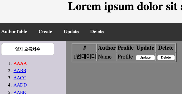 var authorPage = function(){ var trs = ` <tr> <td class="table-idx">1번데이터</td> <td>Name</td> <td>Profile</td> <td><button class="button-edit">Update</button></td> <td><button class="button-edit">Delete</button></td> </tr>\n`; var table = ` <table class="author-table" border=2> <th class="table-idx">#</th> <th>Author</th> <th>Profile</th> <th>Update</th> <th>Delete</th> ${trs} </table>`; document.querySelector('.right').innerHTML = table; }; window.addEventListener("load", authorPage());그리고 홈에서 확인해보니, 기본적인 테이블이 출력되었다.