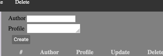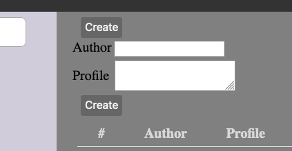 var createForm = function (){ var form = document.createElement("form"); form.setAttribute("charset", "UTF-8"); form.setAttribute("class", "author-form") form.setAttribute("method", "Post"); form.setAttribute("action", "/author/create"); // 전송할 url var list = document.createElement('ul'); var arr = ['Author', 'Profile'] for (var item in arr){ const li = document.createElement("li"); const label = document.createElement("span"); label.innerHTML = arr[item]; const input = document.createElement("input"); input.setAttribute("type", "text"); input.setAttribute("name", arr[item]); li.appendChild(label); li.appendChild(input); list.appendChild(li); }; const submit = document.createElement("input"); submit.setAttribute("type", "submit"); submit.setAttribute("value", "Create"); submit.setAttribute("class", "button-edit"); form.appendChild(list); form.appendChild(submit); var div = document.querySelector('.author-edit-area'); div.appendChild(form); }var tableLayout = function (){ var table = document.createElement('table'); table.setAttribute('id', 'author-table'); // td, th, tr 생성 부분 const div = document.createElement("div"); div.setAttribute('class', 'author-edit-area'); const create = document.createElement("button"); create.innerHTML = "Create"; create.setAttribute('class', 'button-edit'); create.setAttribute('onclick', 'createForm();'); // onclick에 추가 div.appendChild(create); document.querySelector('.right').innerHTML = ``; document.querySelector('.right').appendChild(div); document.querySelector('.right').appendChild(table); return table; }이제 Create를 누르면 아래에 폼이 생긴다.