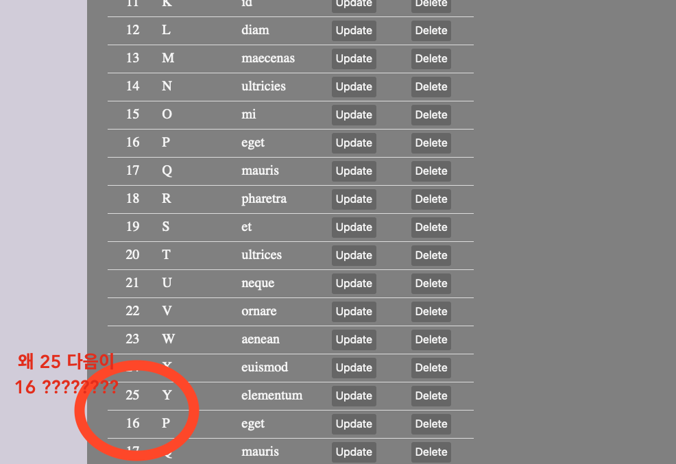 var letter = ['A', 'B', 'C', 'D', 'E', 'F', 'G', 'H', 'I', 'J', 'K', 'L', 'M', 'N', 'O', 'P', 'Q', 'R', 'S', 'T', 'U', 'V', 'W', 'X', 'Y', 'Z']; var words = 'justo donec enim diam vulputate ut pharetra sit amet aliquam id diam maecenas ultricies mi eget mauris pharetra et ultrices neque ornare aenean euismod elementum nisi'.split(" "); for (var i in letter) { var name = letter[i]; var profile = words[i]; db.query('INSERT INTO authorTest (name, profile) VALUES (?, ?)', [name, profile], function(err, result){ if (err) {throw err}; }); };그리고 현재 비어있는 토픽목록 db의 author_id에 랜덤으로 아이디를 넣어준다.