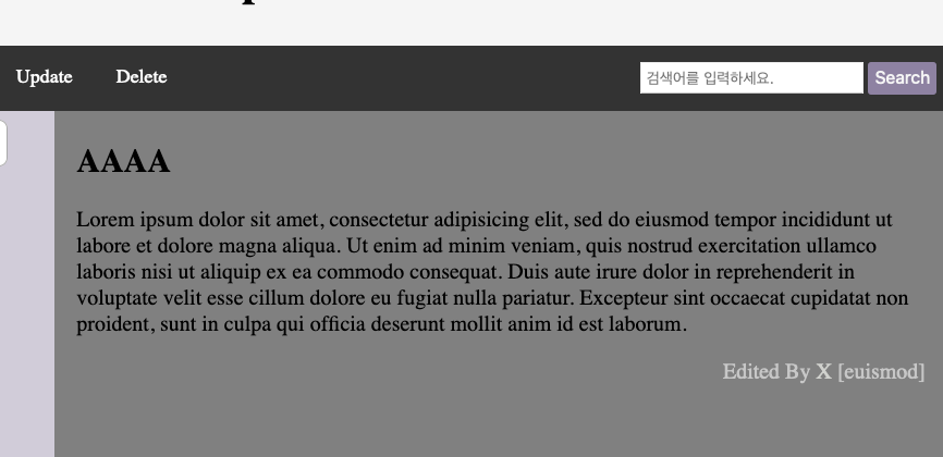 var viewContent = function(id){ fetch('/content/' + String(id)).then(function(response){ response.json().then(function(data){ var content = `<h2>${data[0]['title']}</h2> <p>${data[0]['description']}</p> <p class="author">Edited By <span class="name">${data[0]['authorName']}</span> <span class="profile">[${data[0]['authorProfile']}]</span> </p>`; document.querySelector('.right').innerHTML = content; onEdit(); }); }); };CSS도 추가해주고, 잘 출력되는지 확인해본다.