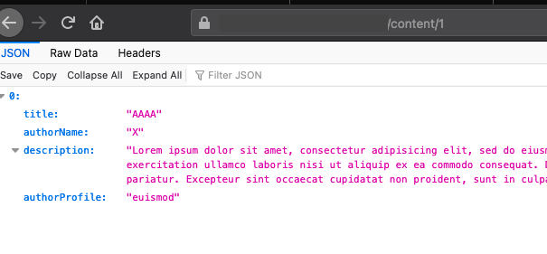 mysql> SELECT JSON_ARRAYAGG(JSON_OBJECT('title', test.title, 'authorName', authorTest.name, 'authorProfile', autho rTest.profile)) as 'return' FROM test LEFT JOIN authorTest ON test.author_id=authorTest.id WHERE test.id=1; +--------------------------------------------------------------------+ | return | +--------------------------------------------------------------------+ | [{"title": "AAAA", "authorName": "X", "authorProfile": "euismod"}] | +--------------------------------------------------------------------+ 1 row in set (0.00 sec)기존에 있던 content API의 쿼리를 저걸로 교체하고,