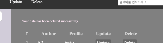 } else if (status === 'deleted'){ msg.innerHTML = 'Your data has been deleted successfully.'; }그리고 Delete를 눌러보면 무사히 삭제되는 걸 확인할 수 있다.