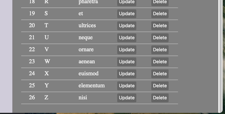더보기.author-table { border: none; border-collapse: collapse; padding: 10px; margin: 10px; } .table-idx { background-color: gray; border-bottom: gray; color: #D7D7D7; padding: 1px; text-align: center; min-width: 15px; max-width: 18px; } .author-table td { border-bottom: 1px solid #ddd; color: whitesmoke; padding: 5px 6px 5px 10px; border-left: none; border-right: none; width: 100px; } .author-table th { border-bottom: 1px solid #ddd; padding: 5px; background-color: gray; color: #D7D7D7; min-width: 60px; } .button-edit { margin: 0 15px; background: #666666; border: none; border-radius: 3px; color: whitesmoke; cursor: pointer; font-size: 16px; padding: 4px 6px 6px 6px; }