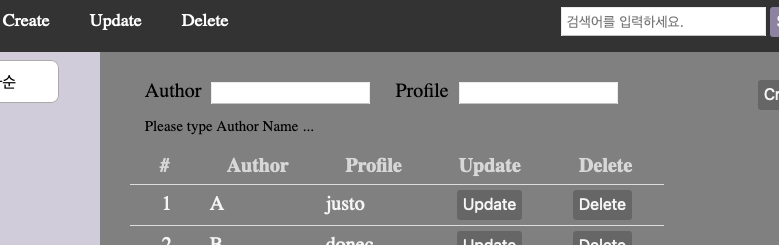 Create 버튼을 누르면 저자 생성 폼이, Update를 누르면 해당 저자 업데이트 폼이 뜨고, Delete를 누르면 저자가 삭제되는 식이다.